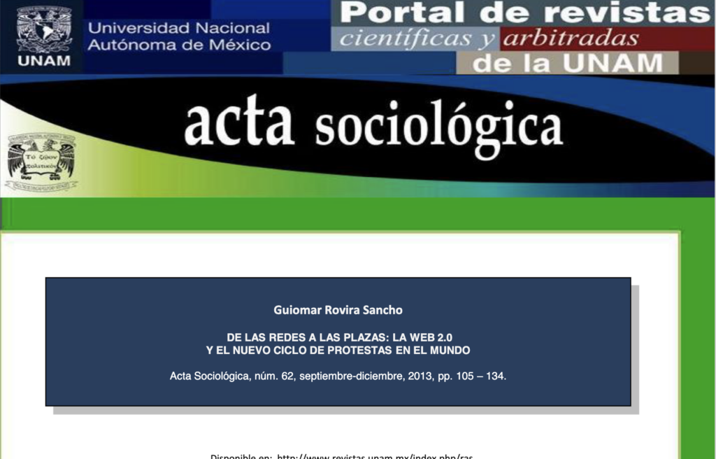 Rovira-Sancho, G. “De las redes a las plazas: la web 2.0 y el nuevo ciclo de protestas en el mundo”, en Revista Acta Sociológica, Nº 62, Septiembre-diciembre 2013, Universidad Nacional Autónoma de México. Pp. 105-134. http://journals.unam.mx/index.php/ras/article/view/44102/39890