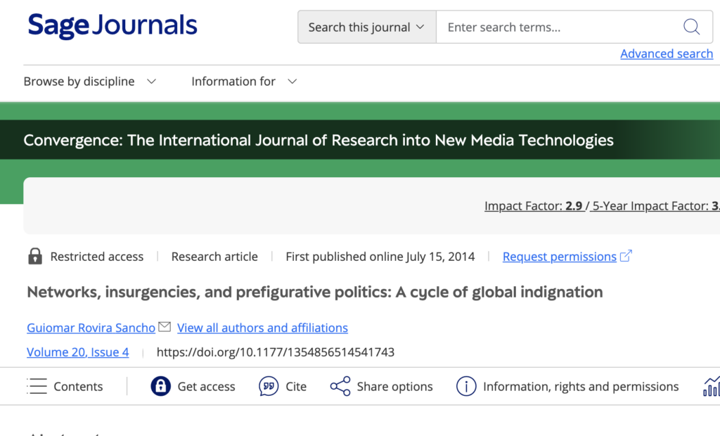 Rovira-Sancho, G. “Networks, insurgencies, and prefigurative politics: A cycle of global indignation”, in Convergence: The International Journal of Research into New Media Technologies, Vol. 20, #4, SAGE, UK, November 2014. Pp. 387-401. https://doi.org/10.1177/1354856514541743